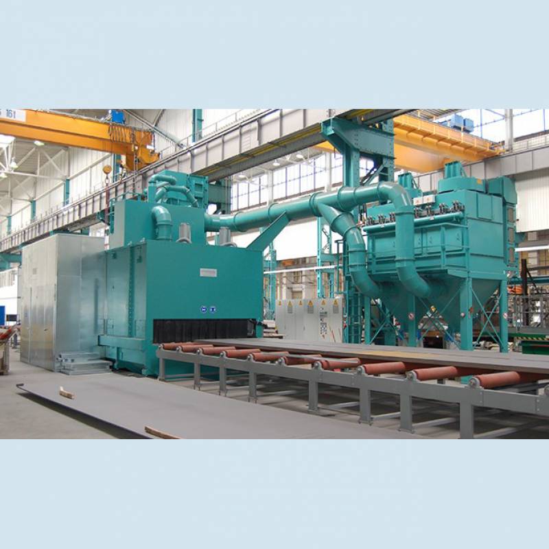 Các loại máy loại bỏ lớp rỉ sét trên bề mặt thép tấm, tấm và các phân đoạn cấu kiện khác, Máy phun bi cánh văng sử dụng băng chuyền con lặn được thiết kế để loại bỏ lớp rỉ sét hoặc bảo quản bề mặt thép bằng phương pháp một lần đi qua hệ thống.