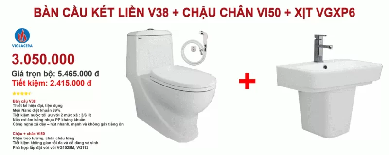 Bàn cầu 1 khối Viglacera V38 + Chậu chân VI50 cao cấp cho công trình, căn hộ tại siêu thị thiết bị vệ sinh Viglacera Cường Quốc. Tổng đại lý Viglacera tại Hà Nội