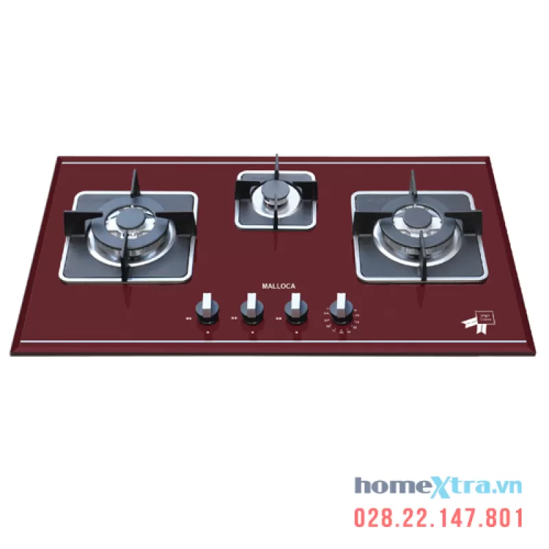 Bếp ga Malloca AS 9403R. Bếp kính âm 3 gas mặt kính cường lực màu đỏ bordeaux. Liên hệ 028.22.147.801