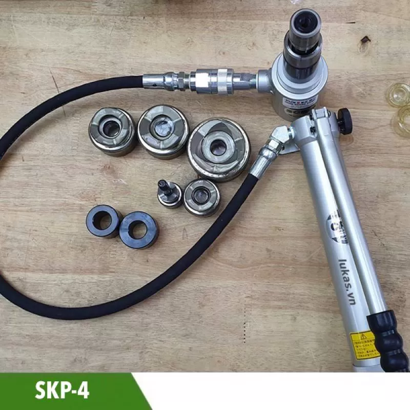 Bộ đục lỗ thủy lực SKP-4 trên thép dày 3,2mm MCC Japan. Bao gồm kích thủy lực, bơm tay và các lưỡi đục. Bulong 3/4 và 3/8". LH 096 927 6080.