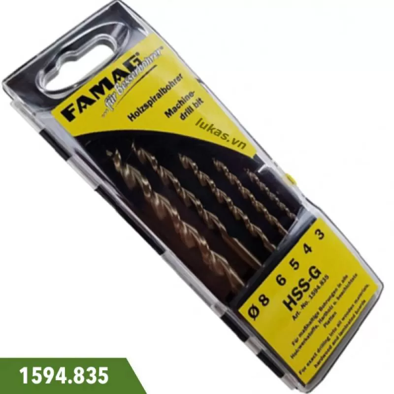 Bộ mũi khoan gỗ 5 cây 3-8mm 1594.835 Famag Germany. Bao gồm 5 size 3, 4, 5, 6, 8mm. Vật liệu HSS-G. Đựng trong hộp nhựa. Sản xuất tại Đức. Lh 0969276080.
