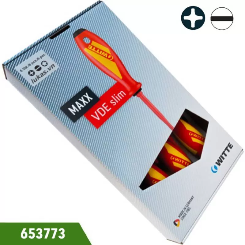 Bộ tua vít 6 món cách điện VDE 1000V, Witte 653773. Đầu dẹt chuẩn ISO 2380. Đầu PH chuẩn ISO 8764. Đựng trong hộp nhựa. Hàng nhập. LH 096 9276 080.
