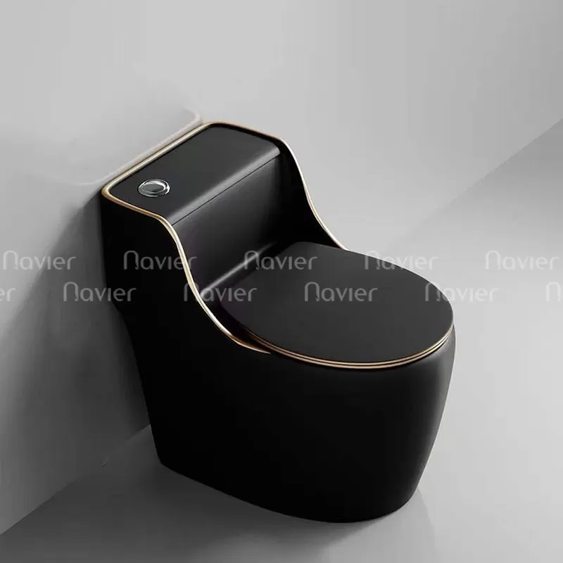 Bồn Cầu 1 Khối Đen Viền Vàng Nút Lệch NV-1013D