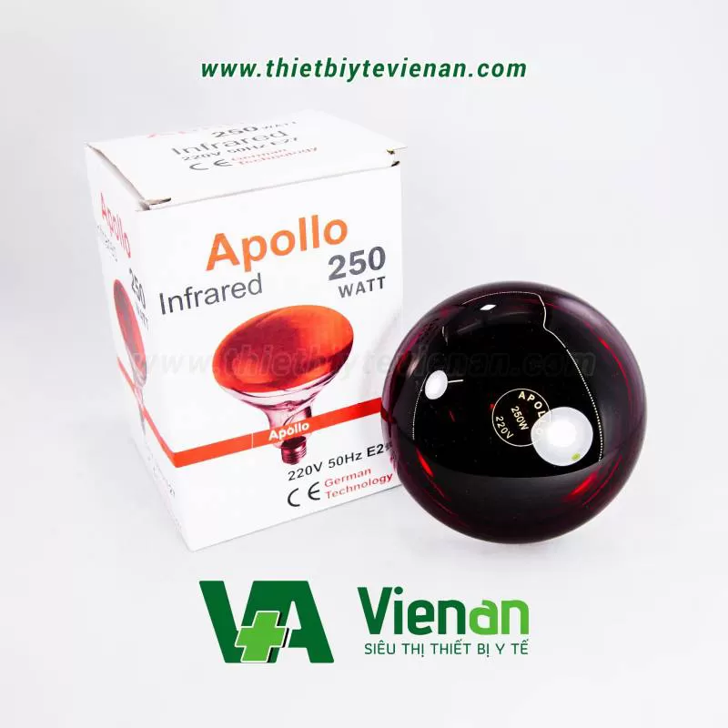 Siêu thị thiết bị y tế Viên An là đơn vị nhập khẩu và phân phối bóng đèn hồng ngoại Apollo 250W chính hãng, sản phẩm chất lượng tuyệt vời, chiếu sáng lâu và ổn định. Sản phẩm mang đến nhiều ứng dụng trong đời sống sinh hoạt và y tế.Tính năng của bóng đèn hồng ngoại Apollo 250W:Một loại ánh sáng phát xạ có bước sóng
