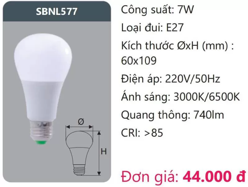 Bóng LED SBNL577 Công suất: 7W Loại đui: E27 Kích thước ØxH (mm): 60 x 109 Điện áp: 220V/50Hz Ánh sáng: 3000K/6500K Quang thông: 740lm CRI: >85 Xem thêm bảng giá Full: https://skyled.com.vn/bang-gia-den-duhal-moi-nhat/