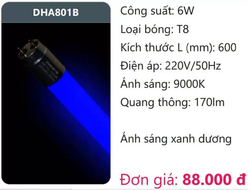 Bóng LED tuýp màu T8 DHA801B Công suất: 6W Loại bóng: T8 Kích thước L (mm): 600 Điện áp: 220V/50Hz Ánh sáng: 9000K Quang thông: 170lm Ánh sáng xanh dương Xem thêm bảng giá Full: https://skyled.com.vn/bang-gia-den-duhal-moi-nhat/