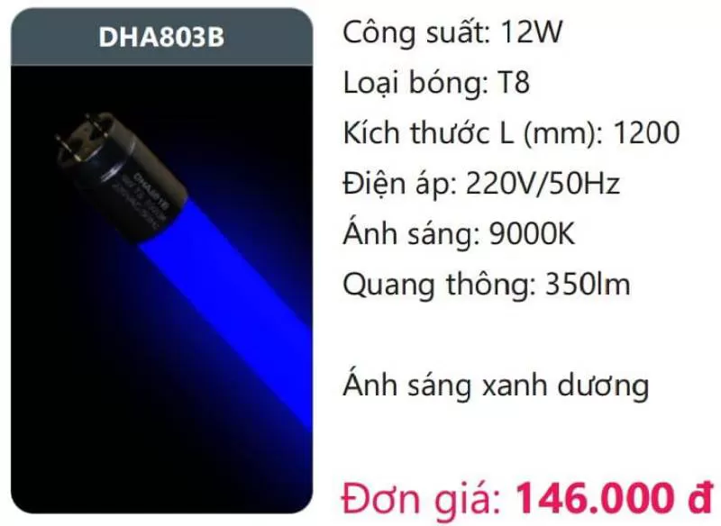Bóng LED tuýp màu T8 DHA803B Công suất: 12W Loại bóng: T8 Kích thước L (mm): 1200 Điện áp: 220V/50Hz Ánh sáng: 9000K Quang thông: 350lm Ánh sáng xanh dương Xem thêm bảng giá Full: https://skyled.com.vn/bang-gia-den-duhal-moi-nhat/