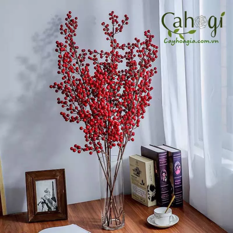 Chất liệu: Cành lõi thép bọc giấy sáp, Qủa xốp bọc nhựa sơn đỏ.