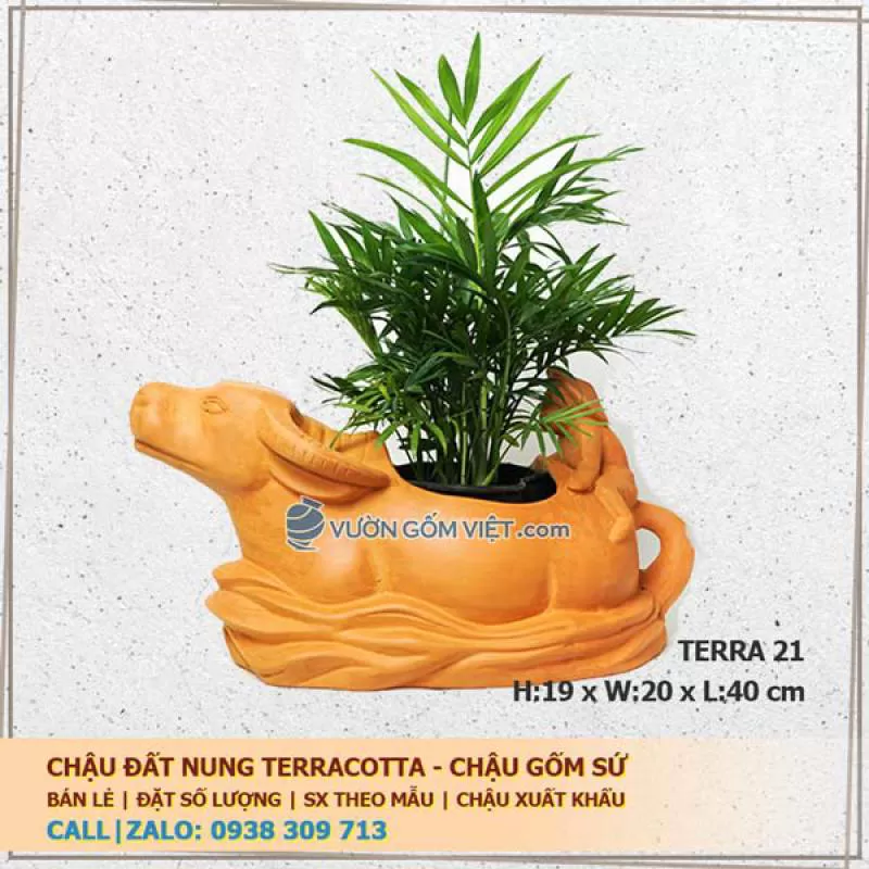 Được thiết kế với hình dáng con trâu, chậu gốm trồng cây hình thú mang lại vẻ đẹp mới lạ, độc đáo và cả những ý nghĩa tốt đẹp cho không gian bày trí.