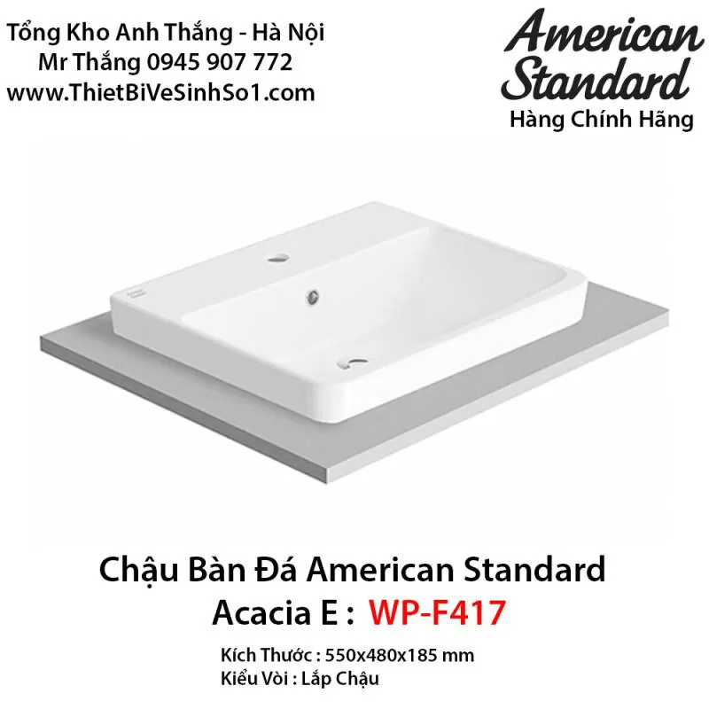 Chậu Rửa Lavabo Bàn Đá American Standard WP-F417 Chính Hãng giá rẻ Phân phối tại miền bắc Tổng Kho Anh Thắng 0945907772 chất lượng và giá thành tốt nhất, Dương Bàn ,Âm Bàn ,Đặt Bàn được bảo hành ,vận chuyển miễn phí tại Hà Nội.