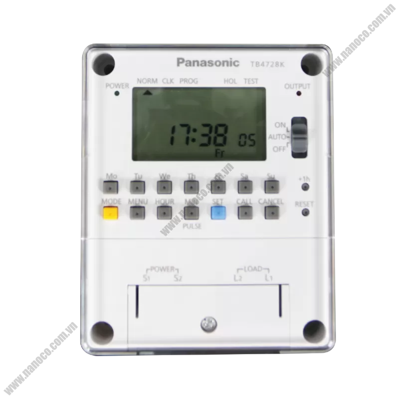 Công tắc đồng hồ điện tử Panasonic TB4728KE7V (Lịch tuần) sử dụng hiệu điện thế 220 - 240VAC/ 15A với 8 chế độ hẹn giờ theo chu kỳ, 15 chế độ hẹn giờ bật/tắt. Thời gian cài tối thiểu 1 phút. Có pin lithium dự trữ 5 năm. Màn hình kỹ thuật số. Chọn 1 ngày nghỉ bất kỳ trong tuần. Giờ mùa hè (1 giờ/1 lần chạm).Shipping/Vận chuyển