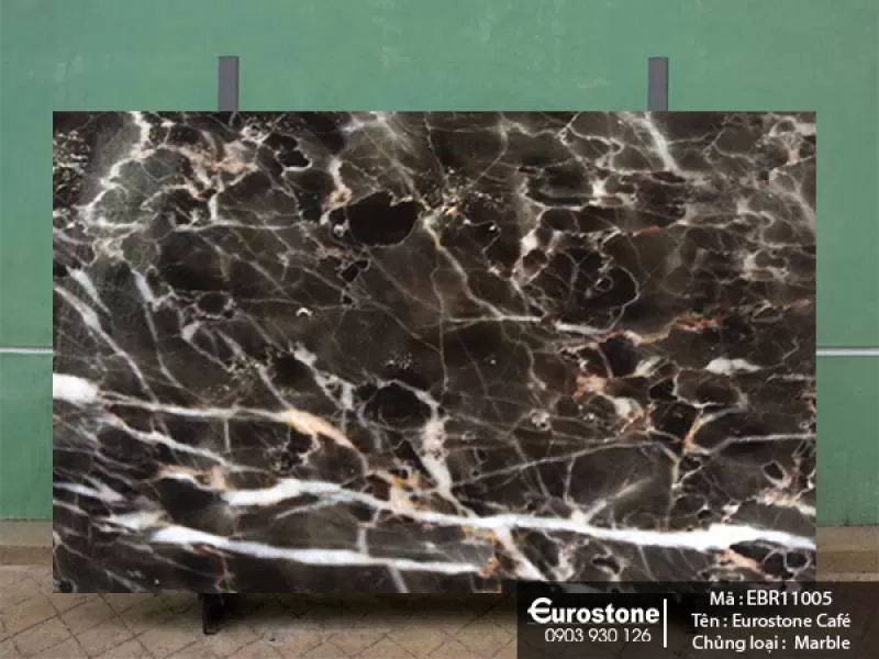 - Mô tả chung: Đá Marble Eurostone Café là dòng đá tự nhiên có nền màu hơi đen với các đường vân trắng cam xen kẽ xuất hiện dày trên bề mặt đá. Chúng phù hợp làm đá ốp tường trang trí, đá lát nền,... không phù hợp cho hạng mục bếp hoặc mặt tiền