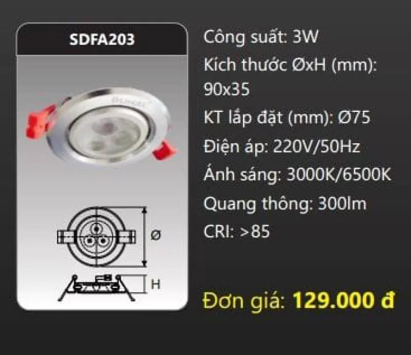 Đèn âm trần LED chiếu điểm SDFA203 Công suất: 3W Kích thước ØxH (mm): 90 x 35 Kích thước khoét lỗ (mm): Ø75 Điện áp: 220V/50Hz Ánh sáng: 3000K/6500K Quang thông: 300lm CRI: >85 IP: 44