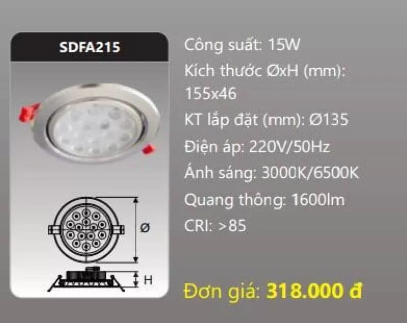 Đèn âm trần LED chiếu điếm SDFA215 Công suất: 15W Kích thước ØxH (mm): 155 x 46 Kích thước khoét lỗ (mm): Ø135 Điện áp: 220V/50Hz Ánh sáng: 3000K/6500K Quang thông: 1600lm CRI: >85 IP: 44