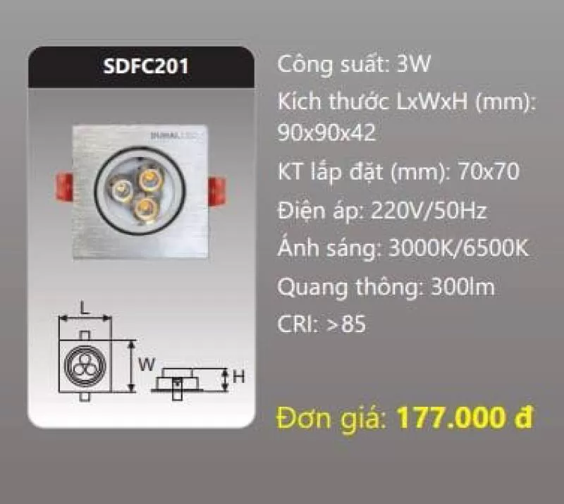 Đèn âm trần LED chiếu điểm SDFC201 Công suất: 3W Kích thước LxWxH (mm): 90 x 90 x 42 Kích thước khoét lỗ (mm): 70 x 70 Điện áp: 220V/50Hz Ánh sáng: 3000K/6500K Quang thông: 300lm CRI: >85 IP: 44