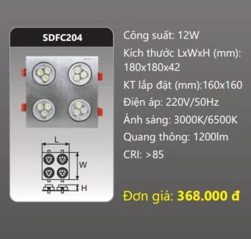 Đèn âm trần LED chiếu điểm SDFC204 Công suất: 12W Kích thước LxWxH (mm): 180 x 180 x 42 Kích thước khoét lỗ (mm): 160 x 160 Điện áp: 220V/50Hz Ánh sáng: 3000K/6500K Quang thông: 1200lm CRI: >85 IP: 44