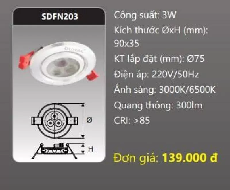 Đèn âm trần LED chiếu điếm SDFN203 Công suất: 3W Kích thước ØxH (mm): 90 x 35 Kích thước khoét lỗ (mm): Ø75 Điện áp: 220V/50Hz Ánh sáng: 3000K/6500K Quang thông: 300lm CRI: >85 IP: 44