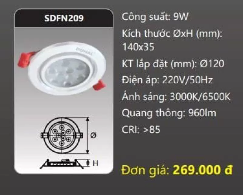 Đèn âm trần LED chiếu điếm SDFN209 Công suất: 9W Kích thước ØxH (mm): 140 x 35 Kích thước khoét lỗ (mm): Ø120 Điện áp: 220V/50Hz Ánh sáng: 3000K/6500K Quang thông: 960lm CRI: >85 IP: 44