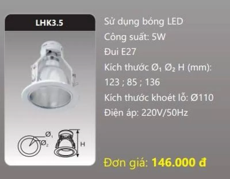 Đèn DOWNLIGHT âm trần có kính LHK3.5 Sử dụng bóng LED Công suất: 5W Đui E27 Kích thước Ø1 Ø2 H (mm): 123, 85, 136 Kích thước khoét lỗ: Ø110 Điện áp: 220V/50Hz