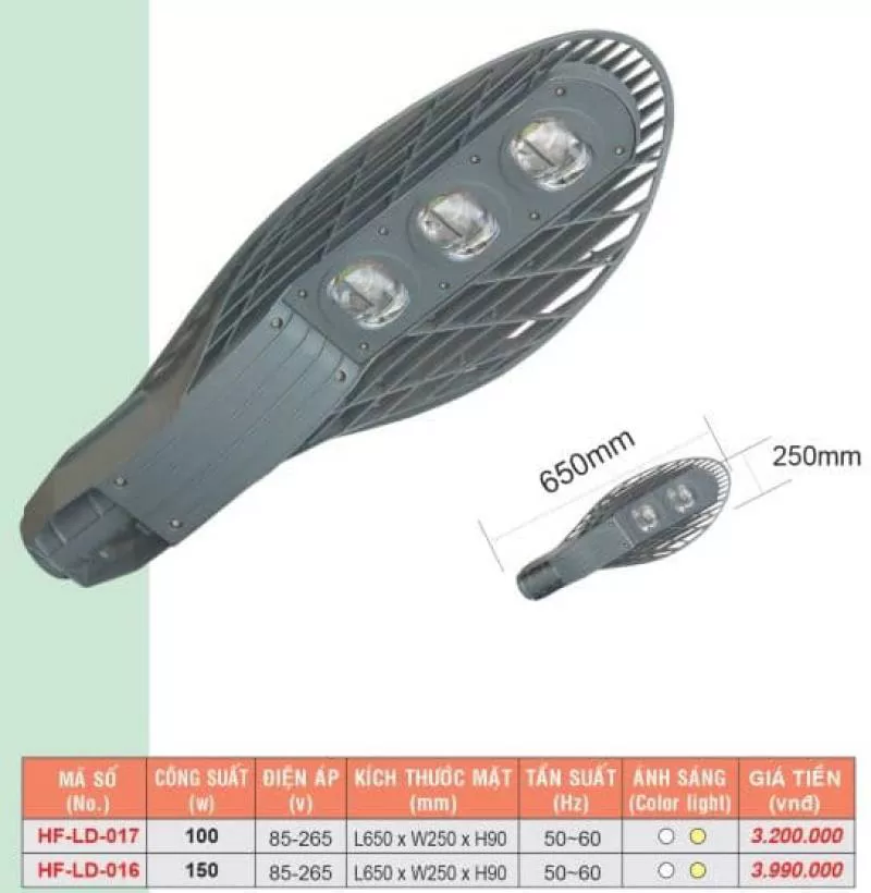 Đèn đường HF-LD-016 Công suất (w): 150, điện áp (V): 85-265, Kích thước mặt (mm): L810 x W310 x H110, tần suất (Hz): 50~60, sang trọng