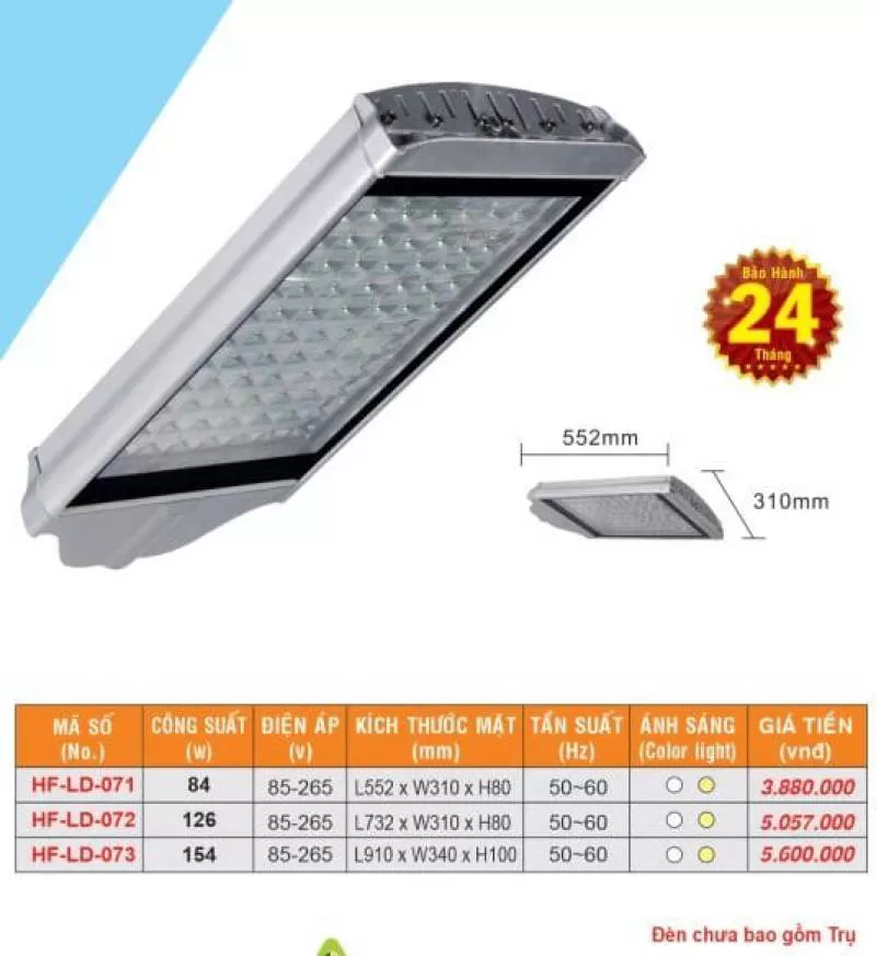 Đèn đường HF-LD-071Công suất (w): 84, Điện áp (V): 85-265, kích thước mặt (mm): L552 x W310 x H80, Tần suất (Hz): 50~60, sang trọng hiện đại.