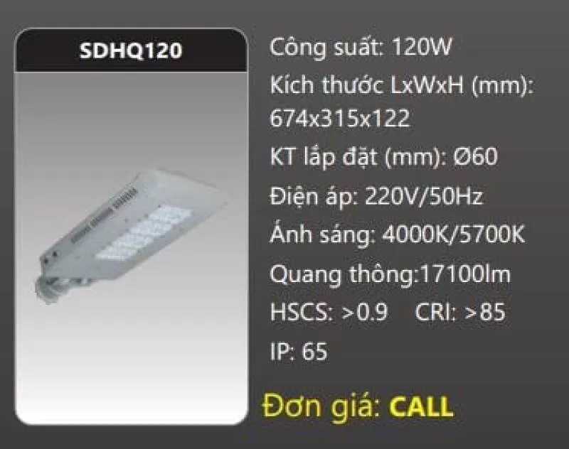 Đèn đường LED SDHQ120 Công suất: 120W Kích thước LxWxH (mm): 674 x 315 x 122 Điện áp: 220V/50Hz Ánh sáng: 4000K/5700K Quang thông: 17100lm HSCS: >0.9 CRI: >85 IP: 65Shipping/Vận chuyển
