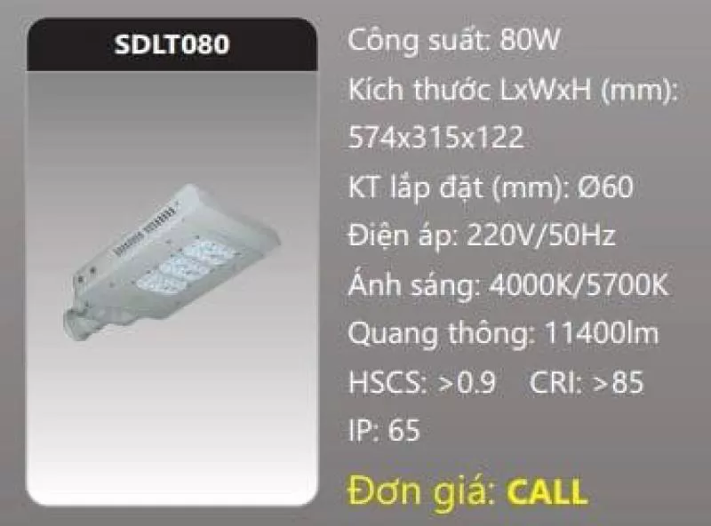 Đèn đường LED SDLT080 Công suất: 80W Kích thước LxWxH (mm): 574 x 315 x 122 Điện áp: 220V/50Hz Ánh sáng: 4000K/5700K Quang thông: 11400lm HSCS: >0.9 CRI: >85 IP: 65Shipping/Vận chuyển