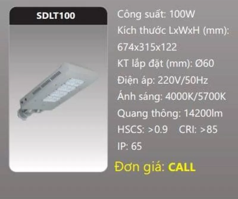 Đèn đường LED SDLT100 Công suất: 100W Kích thước LxWxH (mm): 674 x 315 x 122 Điện áp: 220V/50Hz Ánh sáng: 4000K/5700K Quang thông: 14200lm HSCS: >0.9 CRI: >85 IP: 65Shipping/Vận chuyển