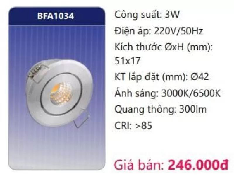 Công suất: 3W Kích thước ØxH (mm): 51 x 17 Kích thước lắp đặt (mm): Ø42 Điện áp: 220V/50Hz Ánh sáng: 3000K/6500K Quang thông: 300lm CRI: >85