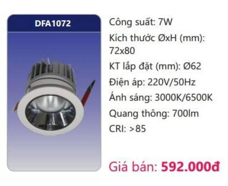 Công suất: 7W Kích thước ØxH (mm): 72 x 80 Kích thước lắp đặt (mm): Ø62 Điện áp: 220V/50Hz Ánh sáng: 3000K/6500K Quang thông: 700lm CRI: >85