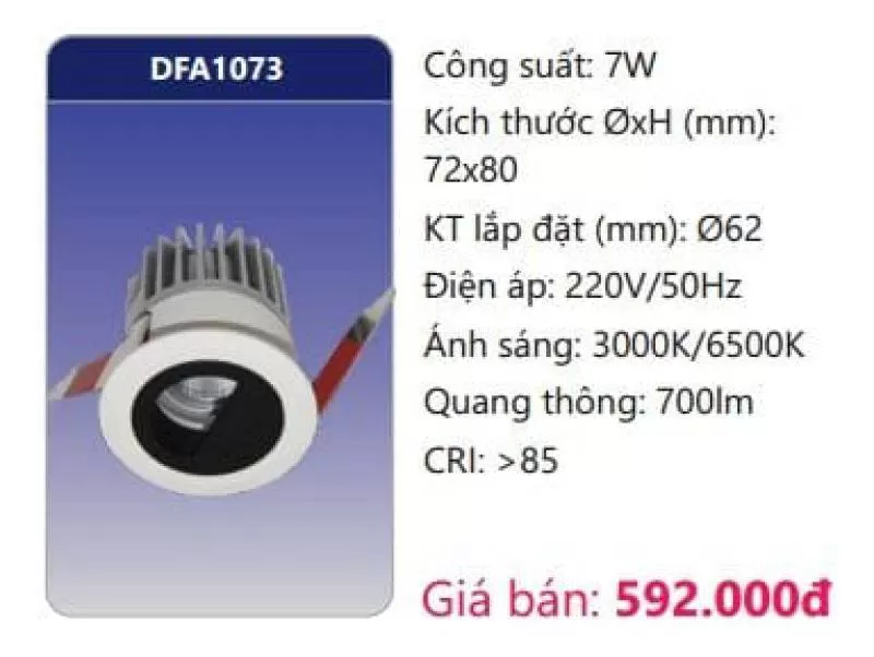 Công suất: 7W Kích thước ØxH (mm): 72 x 80 Kích thước lắp đặt (mm): Ø62 Điện áp: 220V/50Hz Ánh sáng: 3000K/6500K Quang thông: 700lm CRI: >85