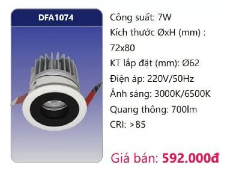 Công suất: 7W Kích thước ØxH (mm): 72 x 80 Kích thước lắp đặt (mm): Ø62 Điện áp: 220V/50Hz Ánh sáng: 3000K/6500K Quang thông: 700lm CRI: >85