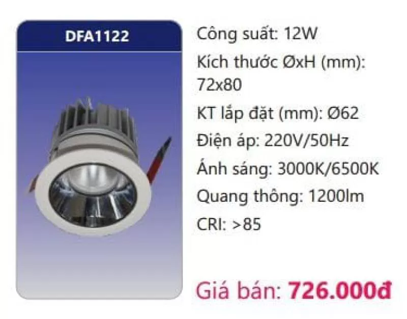 Công suất: 12W Kích thước ØxH (mm): 72 x 80 Kích thước lắp đặt (mm): Ø62 Điện áp: 220V/50Hz Ánh sáng: 3000K/6500K Quang thông: 1200lm CRI: >85