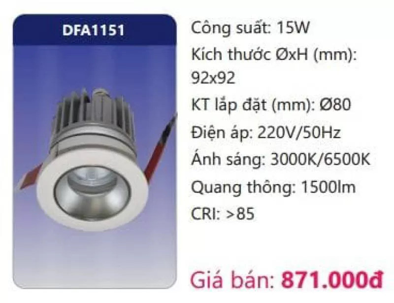 Công suất: 15W Kích thước ØxH (mm): 92 x 92 Kích thước lắp đặt (mm): Ø80 Điện áp: 220V/50Hz Ánh sáng: 3000K/6500K Quang thông: 1500lm CRI: >85