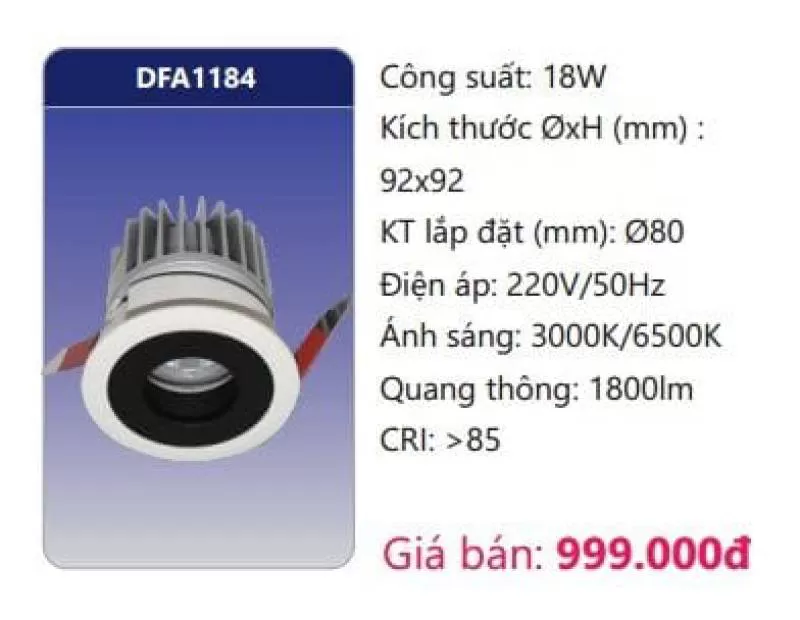 Công suất: 18W Kích thước ØxH (mm): 92 x 92 Kích thước lắp đặt (mm): Ø80 Điện áp: 220V/50Hz Ánh sáng: 3000K/6500K Quang thông: 1800lm CRI: >85