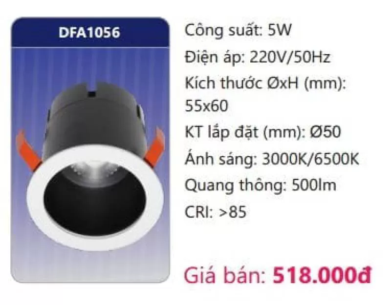 Công suất: 5W Điện áp: 220V/50Hz Kích thước ØxH (mm): 55 x 60 Kích thước lắp đặt (mm): Ø50 Ánh sáng: 3000K/6500K Quang thông: 500lm CRI: >85