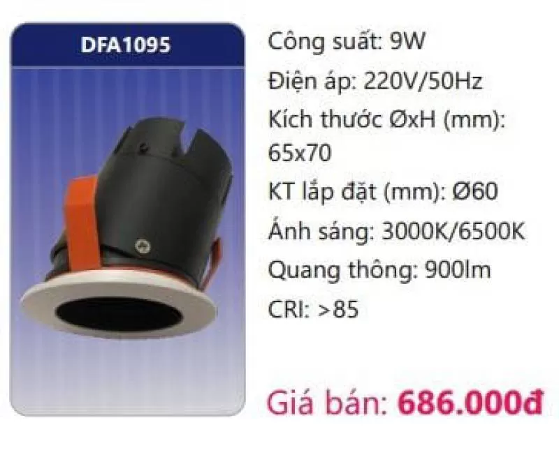 Công suất: 9W Điện áp: 220V/50Hz Kích thước ØxH (mm): 65 x 70 Kích thước lắp đặt (mm): Ø60 Ánh sáng: 3000K/6500K Quang thông: 900lm CRI: >85