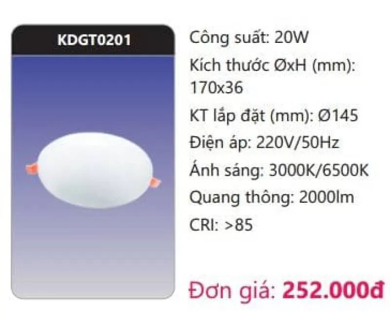Công suất: 20W Kích thước ØxH (mm): 170 x 36 Kích thước lắp đặt (mm): Ø145 Điện áp: 220V/50Hz Ánh sáng: 3000K/6500K Quang thông: 2000lm CRI: >85