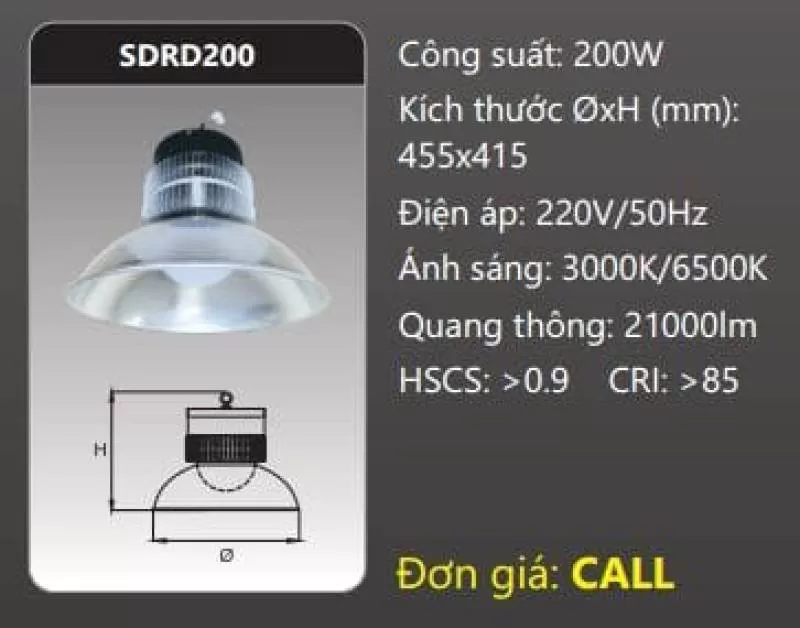 Đèn LED công nghiệp SDRD200 Công suất: 200W Kích thước ØxH (mm): 455 x 415 Điện áp: 220V/50Hz Ánh sáng: 3000K/6500K Quang thông: 21000lm HSCS: >0.9 CRI: >85 IP: 44Shipping/Vận chuyển