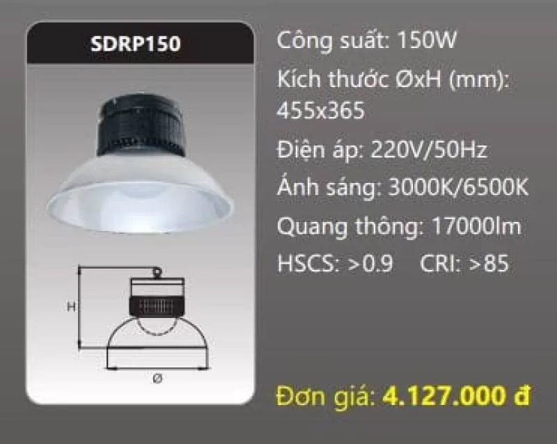 Đèn LED công nghiệp SDRP150 Công suất: 150W Kích thước ØxH (mm): 455 x 365 Điện áp: 220V/50Hz Ánh sáng: 3000K/6500K Quang thông: 17000lm HSCS: >0.9 CRI: >85 IP: 44