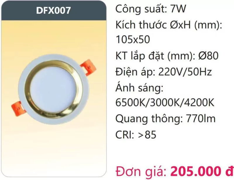 Đèn LED Downlight đổi màu DFX007 Công suất: 7W Kích thước ØxH (mm): 105 x 50 KT lắp đặt (mm): Ø80 Điện áp: 220V/50Hz Ánh sáng: 6500K/3000K/4200K Quang thông: 770lm CRI: >85 Xem thêm bảng giá Full: https://skyled.com.vn/bang-gia-den-duhal-moi-nhat/