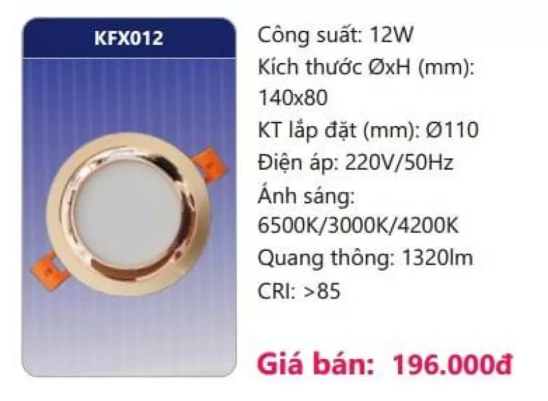 Công suất: 12W Kích thước ØxH (mm): 140 x 80 Kích thước lắp đặt (mm): Ø110 Điện áp: 220V/50Hz Ánh sáng: 3000K/4200K/6500K Quang thông: 1320lm CRI: >85