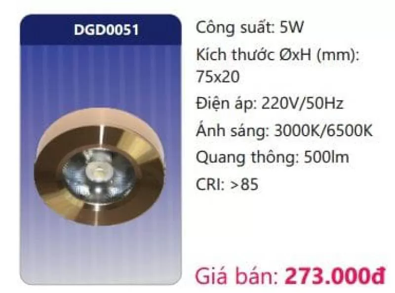 Công suất: 5W Kích thước ØxH (mm): 75 x 20 Điện áp: 220V/50Hz Ánh sáng: 3000K/6500K Quang thông: 500lm CRI: >85