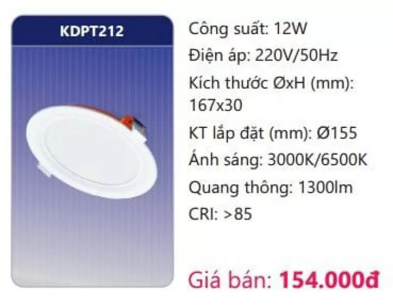 Công suất: 12W Điện áp: 220V/50Hz Kích thước ØxH (mm): 167 x 30 Kích thước lắp đặt (mm): Ø155 Ánh sáng: 3000K/6500K Quang thông: 1300lm CRI: >85