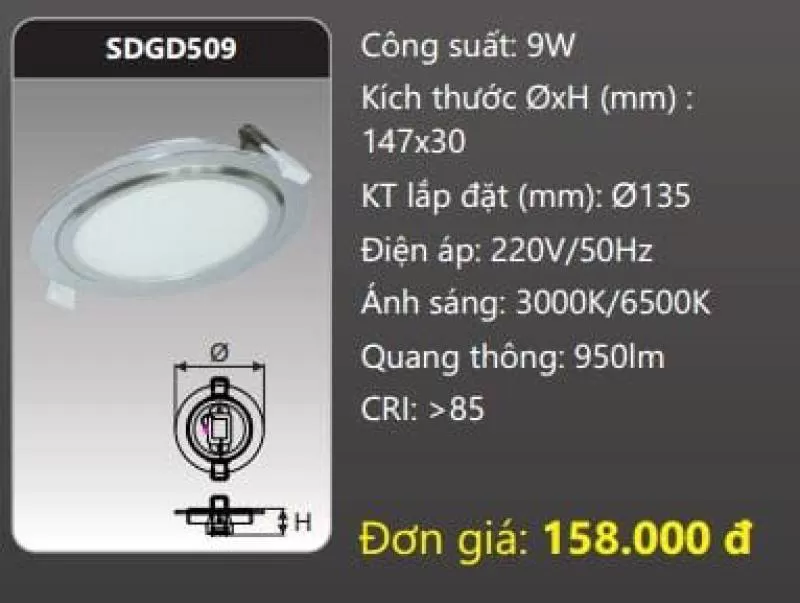 Đèn LED panel âm trần SDGD509 Công suất: 9W Kích thước ØxH (mm): 147 x 30 Kích thước khoét lỗ (mm): Ø135 Điện áp: 220V/50Hz Ánh sáng: 3000K/6500K Quang thông: 950lm CRI: >85 IP: 44