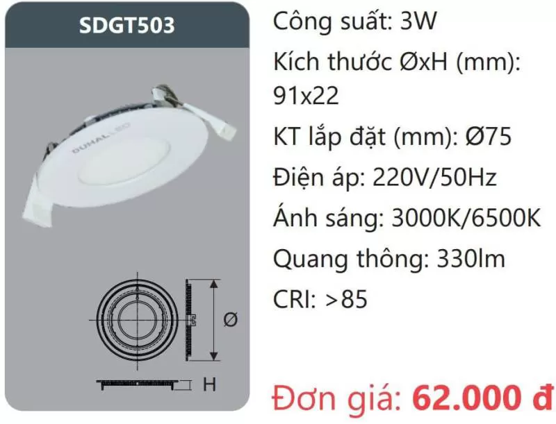 Đèn LED panel âm trần SDGT503 Công suất: 3W Kích thước ØxH (mm): 91 x 22 KT lắp đặt (mm): Ø75 Điện áp: 220V/50Hz Ánh sáng: 3000K/6500K Quang thông: 330lm CRI: >85 Xem thêm bảng giá Full: https://skyled.com.vn/bang-gia-den-duhal-moi-nhat/
