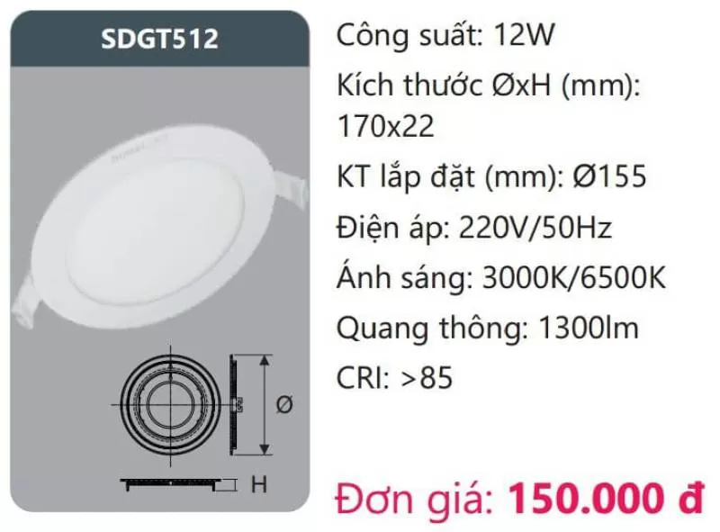 Đèn LED panel âm trần SDGT512 Công suất: 12W Kích thước ØxH (mm): 170 x 22 KT lắp đặt (mm): Ø155 Điện áp: 220V/50Hz Ánh sáng: 3000K/6500K Quang thông: 1300lm CRI: >85 Xem thêm bảng giá Full: https://skyled.com.vn/bang-gia-den-duhal-moi-nhat/