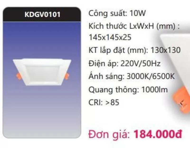 Công suất: 10W Kích thước LxWxH (mm): 145 x 145 x 25 Kích thước lắp đặt (mm): 130 x 130 Điện áp: 220V/50Hz Ánh sáng: 3000K/6500K Quang thông: 1000lm CRI: >85