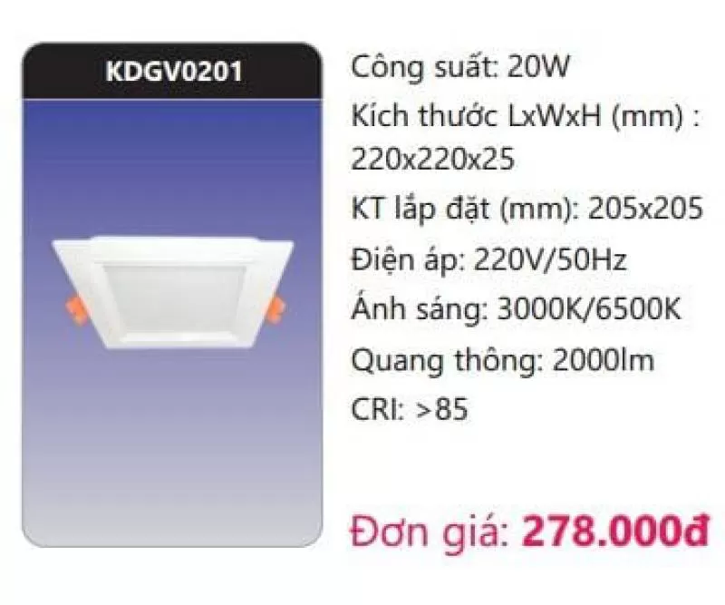 Công suất: 20W Kích thước LxWxH (mm): 220 x 220 x 25 Kích thước lắp đặt (mm): 205 x 205 Điện áp: 220V/50Hz Ánh sáng: 3000K/6500K Quang thông: 2000lm CRI: >85