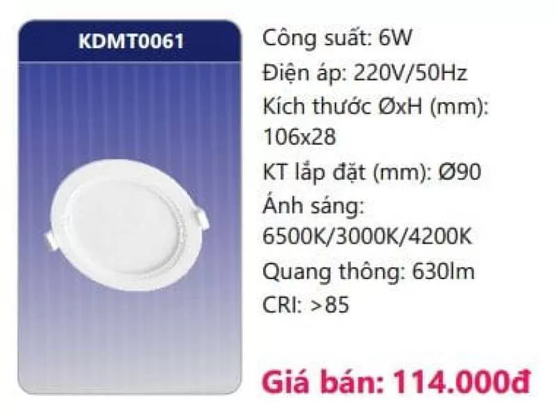 Công suất: 6W Điện áp: 220V/50Hz Kích thước ØxH (mm): 106 x 28 Kích thước lắp đặt (mm): Ø90 Ánh sáng: 3000K/4200K/6500K Quang thông: 630lm CRI: >85